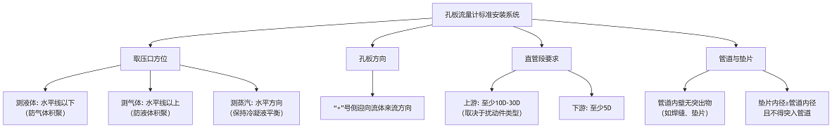 下圖清晰地展示了孔板流量計在管道中的正確安裝方式及各核心要點: